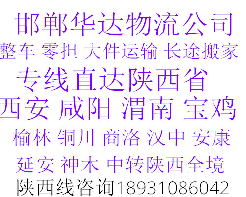 邯鄲到咸陽(yáng)物流公司運(yùn)費(fèi)查詢:18931086042華達(dá)物流以一流的服務(wù)體系,本著安全,準(zhǔn)時(shí),互友,互惠的原則贏得市場(chǎng),只要一個(gè)電話,一切由我公司操辦, 望廣大新老客戶給予大力支持、與我公司聯(lián)絡(luò),我們將竭誠(chéng)為您提供一切方便,歡迎來(lái)人來(lái)電咨詢!